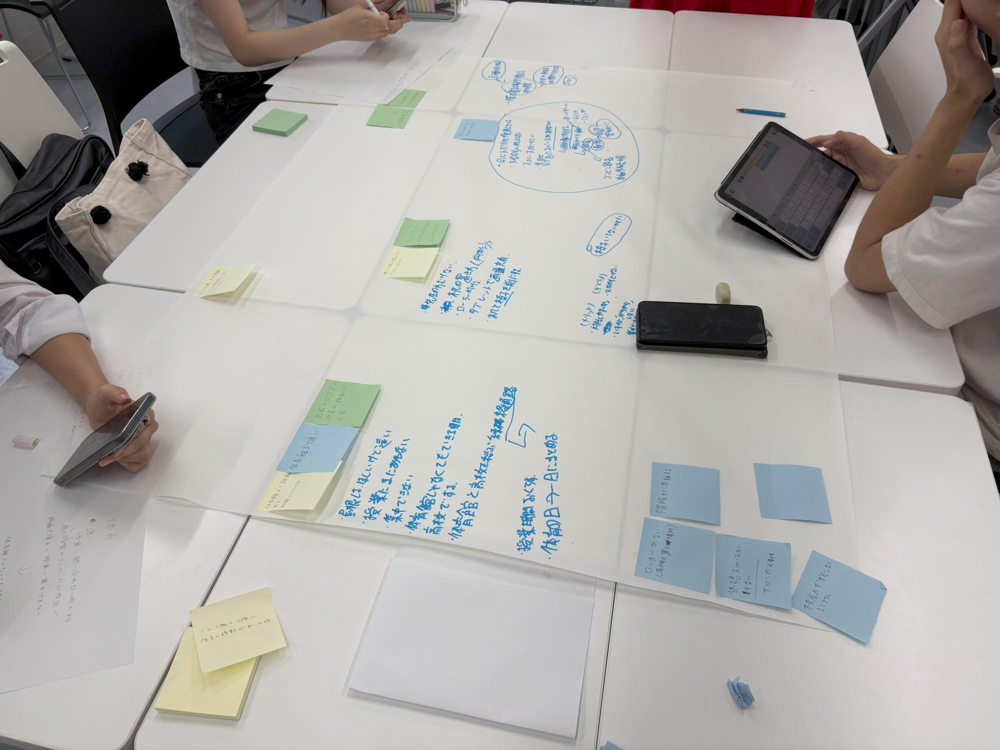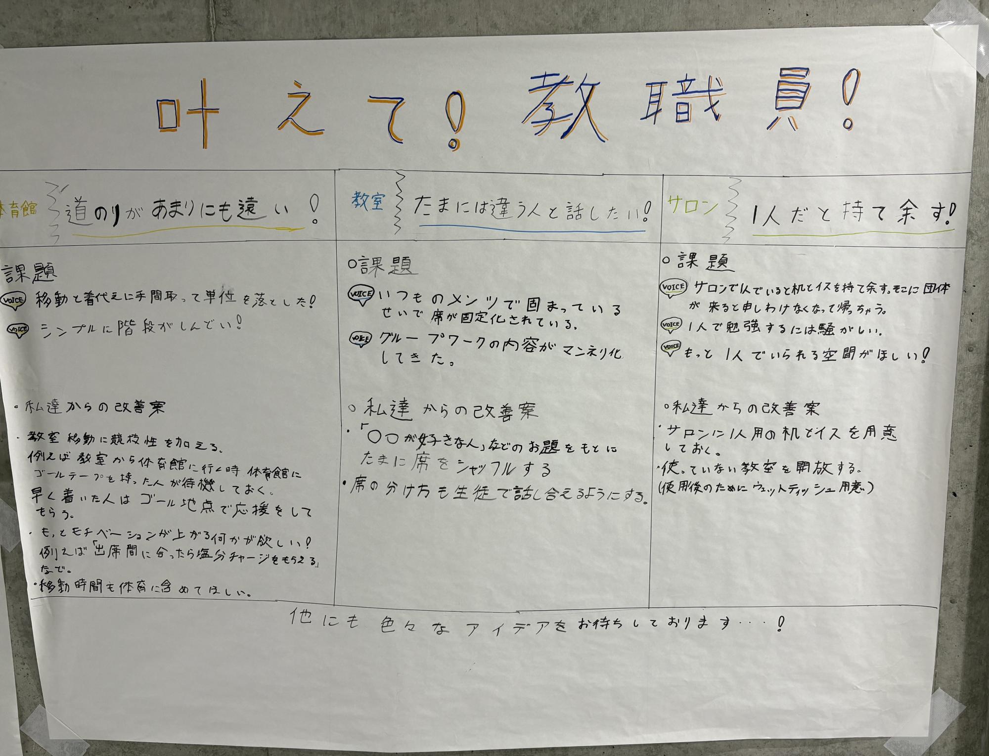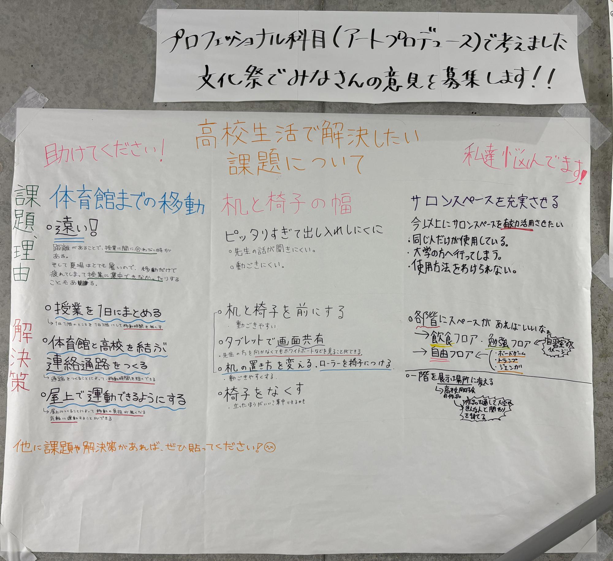 生徒たちが考えた解決策は模造紙にまとめられ、その内容は創々館の階段付近に貼られ、授業を受けていない人たちにも共有されています。