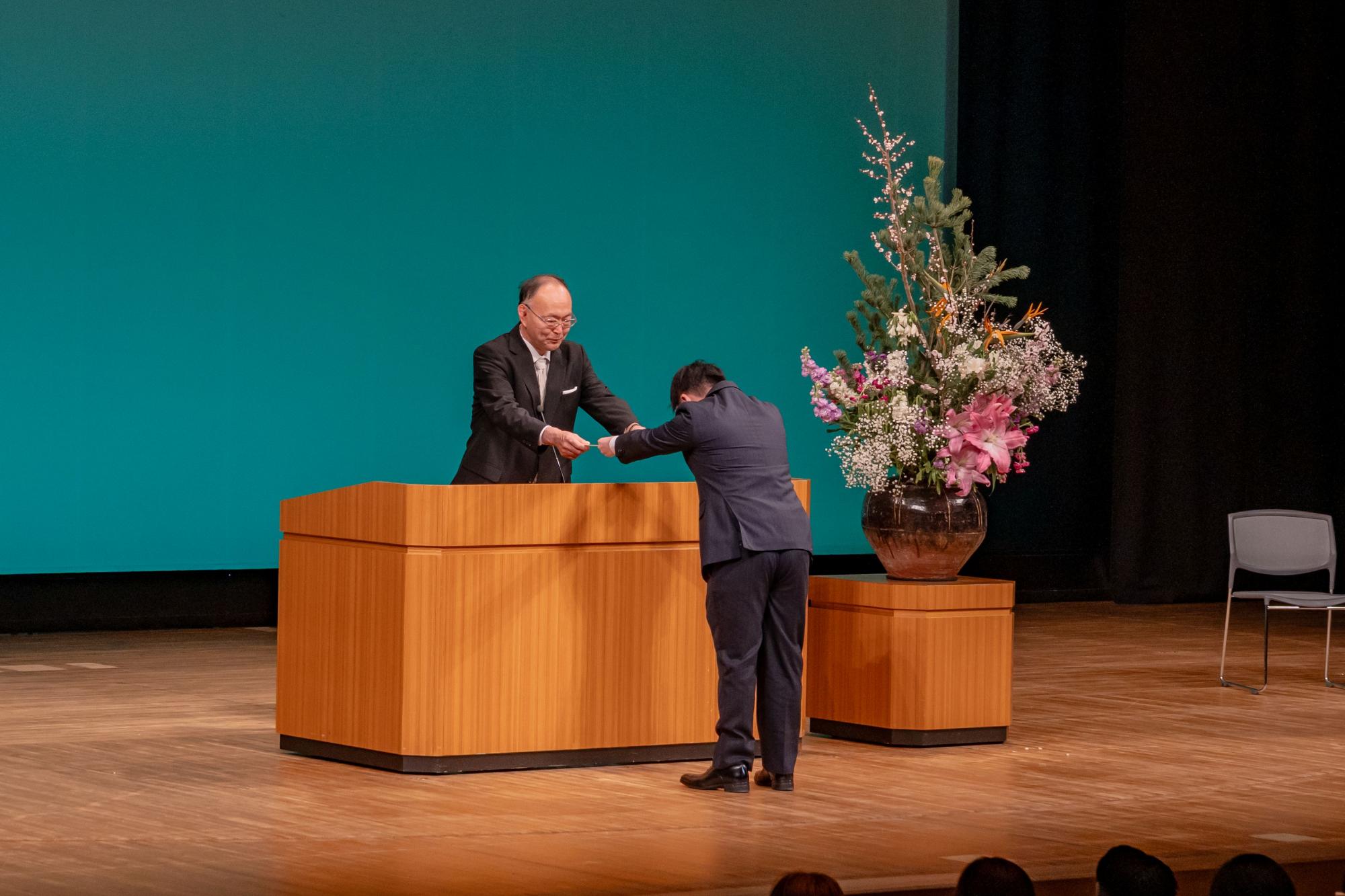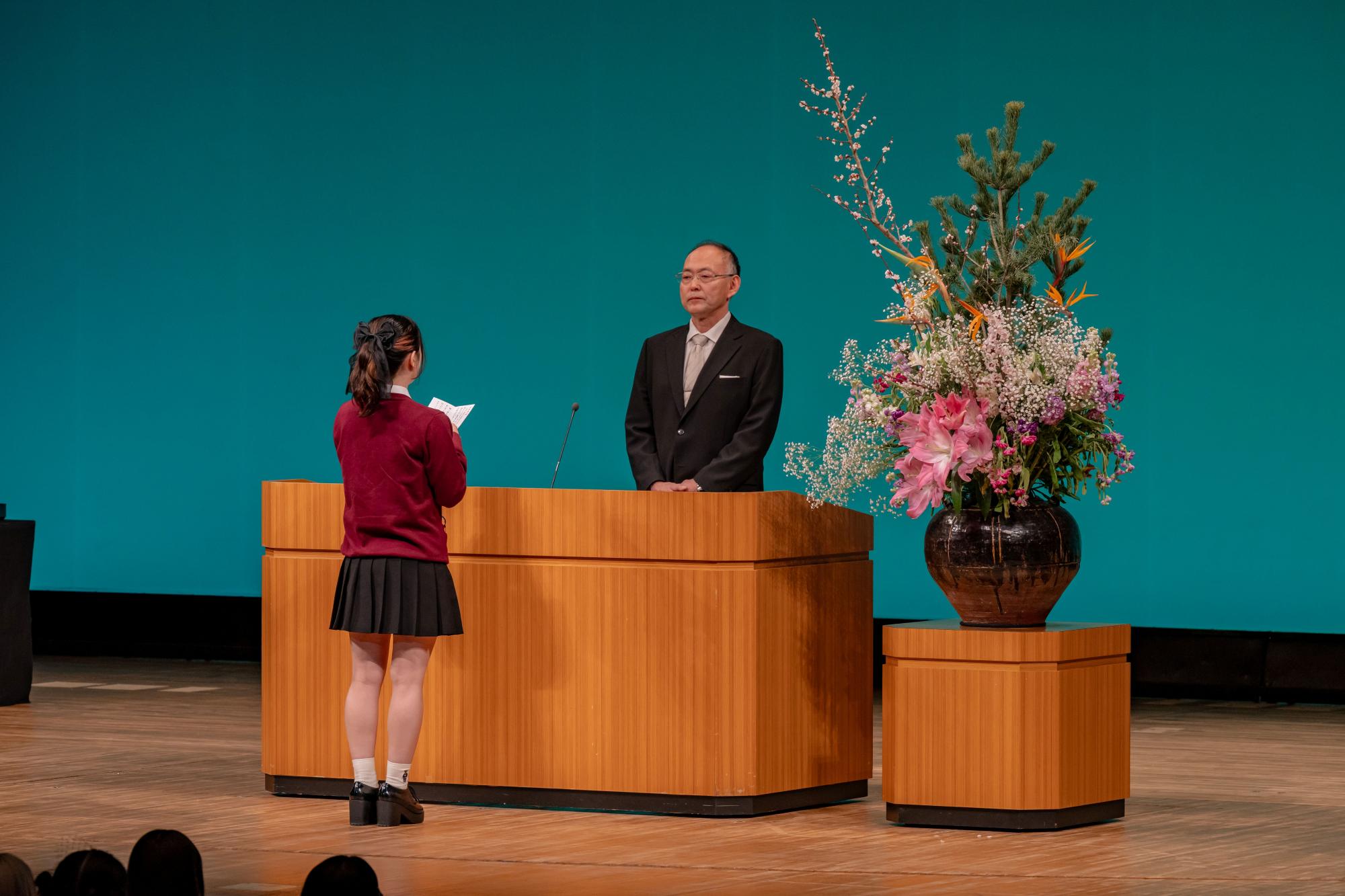 卒業証書授与ではクラスごとに名前を呼ばれた後、代表者が卒業証書を受け取りに登壇しますが、代表者も証書を渡す校長先生も緊張されているように見えました。